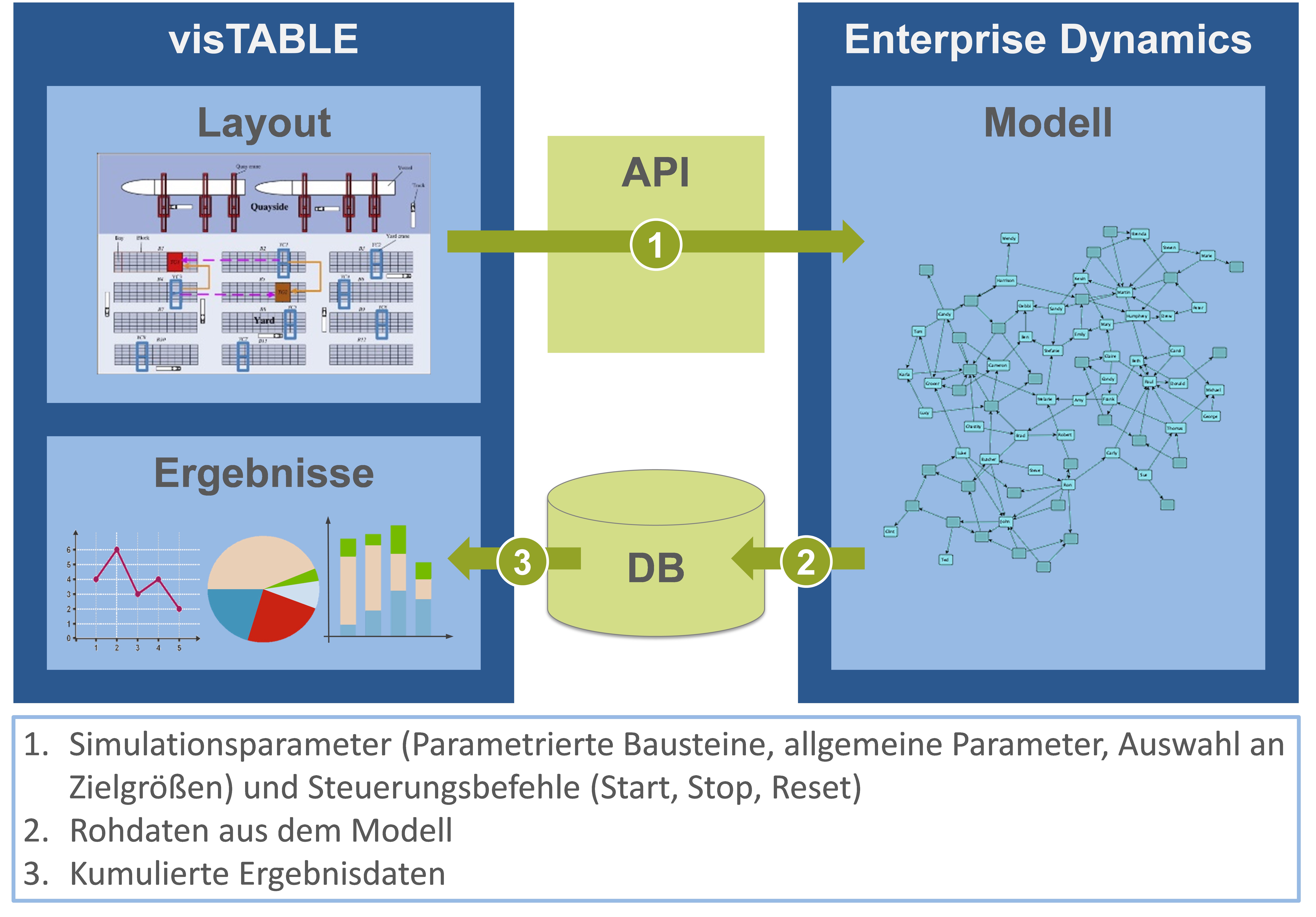 Entwicklung einer Lösung, die statische Layouts auf einem berührungssensitiven und intuitiv zu bedienenden Planungstisch erstellt, um sie dann direkt in ein funktionsfähiges dynamisches Simulationsmodell mit hinterlegten Logistikstrategien zu übertragen. Insbesondere diese hinterlegten Strategien sind die Hauptsäule bei der Integration, da sie das fehlende Glied zwischen Layoutplanung und Simulation darstellen. Die Softwarelösung führt zu erheblichen Zeitersparnissen bei der Planung von logistischen Knoten, da in der Regel Simulationsmodelle für logistische Knoten in aufwendiger Detailarbeit (basierend auf dem Layout) von Experten erstellt werden müssen.