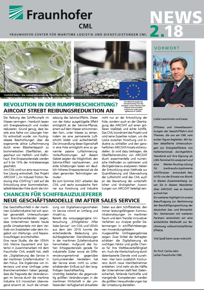 Newsletter 2.18 vom 26.06.2018; Themen: AIRCOAT: Revolution in der Rumpfbeschichtung? / Chancen für Schiffbauzulieferer: Neue Studie zur Digitalisierung von Geschäftsprozessen / Deutsche See- und Binnenhäfen: Bestimmung der Beschäftigungseffekte / Fraunhofer auf der SMM 2018: Highlights der maritimen Forschung