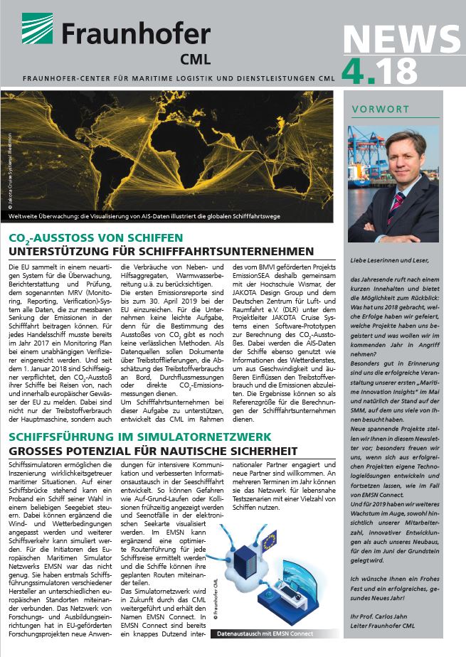 Newsletter 1.18 vom 3.04.2018; Themen: Verbesserung der Containerinspektion / MII - Maritime Innovation Insights des CML sowie Einblicke in Hafen und Schifffahrt der Zukunft / Realistische nautische Verkehrssimulationen im Ärmelkanal und in der südlichen Ostsee / Risikobewertung für IT-Infrastrukturen