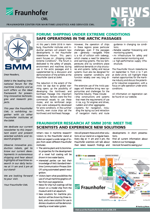 Newsletter 3.18 vom 25.08.2018; Themen: FORUM: Shipping under Extreme Conditions, Safe operations in the Arctic Passages / Fraunhofer-Forschung auf der SMM 2018, Entwicklungen zum Anhören und Anfassen / Crewmanagement: Optimiert und Anforderungsgerecht / Digitalisierung maritimer Operationen in Küstengewässern