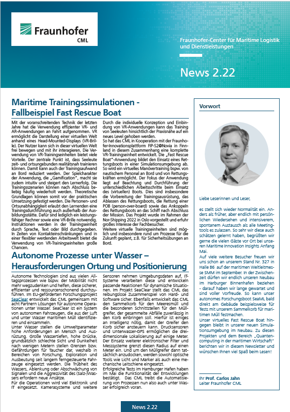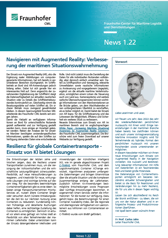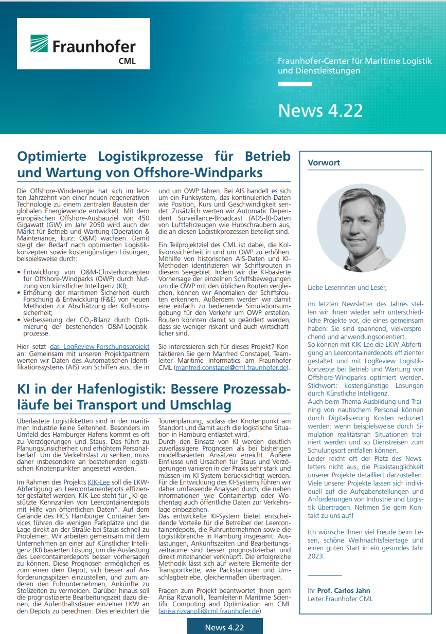Newsletter 4.22 vom 13. Dezember 2022. Themen: KIK-LEE - LKW-Abfertigung an Leercontainerdepots effizienter gestaltet; LogReview - optimierte Logistikkonzepte bei Betrieb und Wartung von Offshore-Windparks und Kosten reduzierung bei Ausbildung und Training von nautischem Personal durch Digitalisierung