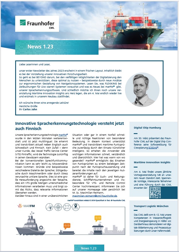 Newsletter 1.23 vom 27. März 2023. Themen: marFM - Spracherkennungstechnologie für den Seefunk; FLEXIKING - KI für die Lkw-Abfertigung an Terminals und BEYOND - aufgabenorientierte Navigationssysteme