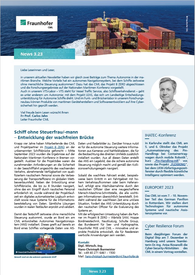 Newsletter 3.23 vom 25. September 2023: Autonome Schifffahrt - wachfreie Brücke und Verkehrssteuerung, Test von Produkten und Geräten auf Cybersecurity in unserem Funk-und Brückenlabor