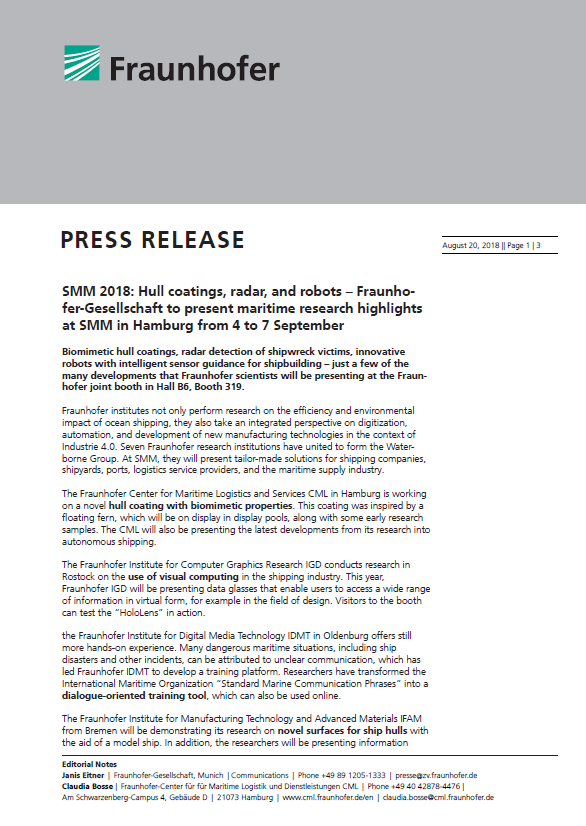 Rumpfbeschichtung, Radar und Roboter - Fraunhofer zeigt auf der SMM Highlights der maritimen Forschung 20. August 2018