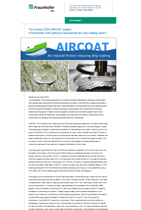 Das Horizon 2020-Projekt AIRCOAT: Eine bionische Rumpfbeschichtung, die den Schiffsbeschichtungssektor revolutioniert? 26. April 2018