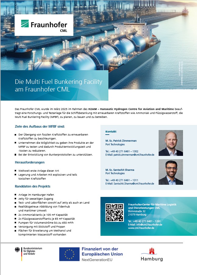 Das Fraunhofer CML wurde im März 2025 im Rahmen des H2AM – Hanseatic Hydrogen Center for Aviation and Maritime beauftragt eine Forschungs- und Testanlage für die Schiffsbetankung mit erneuerbaren Kraftstoffen wie Ammoniak und Flüssigwasserstoff, die Multi Fuel Bunkering Facility (MFBF), zu planen, zu bauen und zu betreiben.